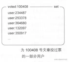 为了防止用户对同一篇文章进行多次投票,网站需要为每篇文章记录一个已投票用户名单。为此,程序将为每篇文章创建一个集合,并使用这个集合来存储所有已投票用户的ID,下图展示了一个这样的集合示例。