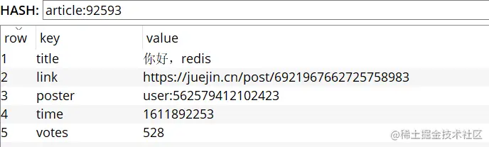 构建文章投票网站除了需要计算文章评分之外,还需要使用Redis 结构存储网站上的各种信息。对于网站里的每篇文章,程序都使用一个散列来存储文章的标题、指向文章的网址、发布文章的用户、文章的发布时间、文章得到的投票数量等信息,下图一个使用hash来存储文章信息的例子