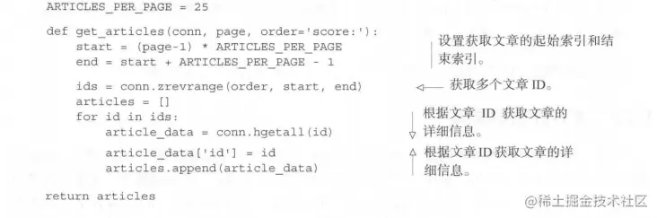 好了,我们已经陆续实现了文章投票功能和文章发布功能,接下来要考虑的就是如何取出评分最高的文章以及如何取出最新发布的文章了。为了实现这两个功能,程序需要先使用 zREVRANGE命令取出多个文章ID,然后再对每个文章ID执行一次HGETALL命令来取出文章的详细信息,这个方法既可以用于取出评分最高的文章,又可以用于取出最新发布的文章。这里特别要注意的一点是,因为有序集合会根据成员的分值从小到大地排列元素,所以使用 zREVRANGE 命令,以"分值从大到小"的排列顺序取出文章ID才是正确的做法,下边的展示了文章获取功能的实现函数。