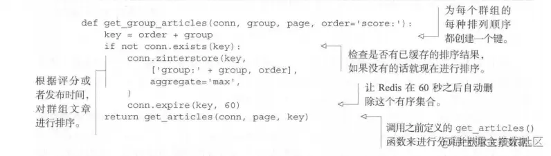 通过对存储群组文章的集合和存储文章评分的有序集合执行zINTERSTORE 命令,程序可以得到按照文章评分排序的群组文章;而通过对存储群组文章的集合和存储文章发布时间的有序集合执行ZINTERSTORE 命令,程序则可以得到按照文章发布时间排序的群组文章。如果群组包含的文章非常多,那么执行 zINTERSTORE命令就会比较花时间,为了尽量减少Redis的工作量,程序会将这个命令的计算结果缓存60秒。另外,我们还重用了已有的get_articles()函数来分页并获取群组文章,下面的代码展示一下网站从群组里面获取一整页文章的方法。