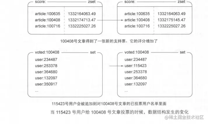 在实现投票功能之前,让我们来看看下图∶这幅图展示了当 115423 号用户给 100408 号文章投票的时候,数据结构发生的变化。