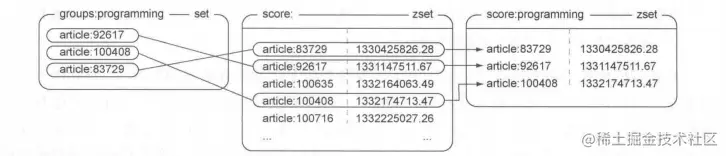 初看上去,可能会有人觉得使用集合来记录群组文章并没有多大用处。到目前为止,大家只看到了集合结构检查某个元素是否存在的能力,但实际上Redis 不仅可以对多个集合执行操作,甚至在一些情况下,还可以在集合和有序集合之间执行操作。 为了能够根据评分对群组文章进行排序和分页(paging ),网站需要将同一个群组里面的所有文章都按照评分有序地存储到一个有序集合里面。Redis 的 ZINTERSTORE 命令可以接受多个集合和多个有序集合作为输入,找出所有同时存在于集合和有序集合的成员,并以几种不同的方式来合并(combine)这些成员的分值(所有集合成员的分值都会被视为是 1)。对于我们的文章投票网站来说,程序需要使用ZTNTERSTORE 命令选出相同成员中最大的那个分值来作为交集成员的分值∶取决于所使用的排序选项,这些分值既可以是文章的评分,也可以是文章的发布时间。