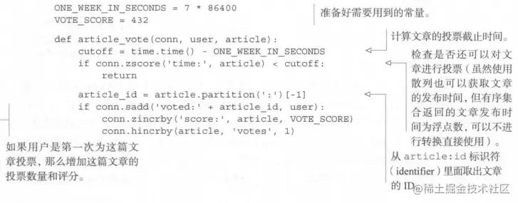 我们已经知道了网站计算文章评分的方法,也知道了网站存储数据所需的数据结构,那么现在是时候实际地实现这个投票功能了!当用户尝试对一篇文章进行投票时,程序需要使用zScORE 命令检查记录文章发布时间的有序集合,判断文章的发布时间是否未超过一周。如果文章仍然处于可以投票的时间范围之内,那么程序将使用SADD命令,尝试将用户添加到记录文章已投票用户名单的集合里面。如果添加操作执行成功的话,那么说明用户是第一次对这篇文章进行投票,程序将使用ZINCRBY命令为文章的评分增加432分(ZINCRBY 命令用于对有序集合成员的分值执行自增操作),并使用HINCRBY命令对散列记录的文章投票数量进行更新(HINCRBY命令用于对散列存储的值执行自增操作)。伪代码如下
