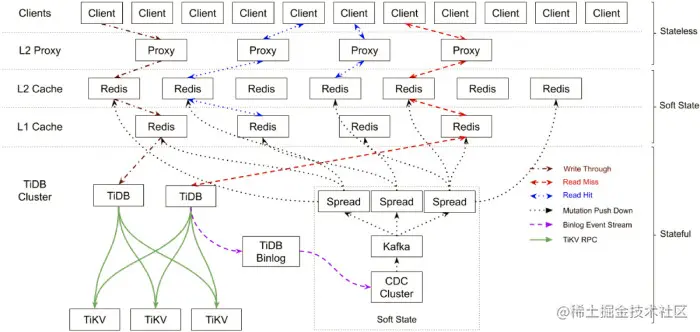**中间层:**软状态组件和分层 Redis 缓存作为主要部分。当服务中断时,这些组件可以通过恢复保存在 TiDB 群集中的数据来自我恢复服务。