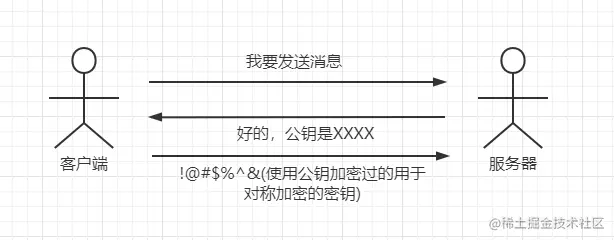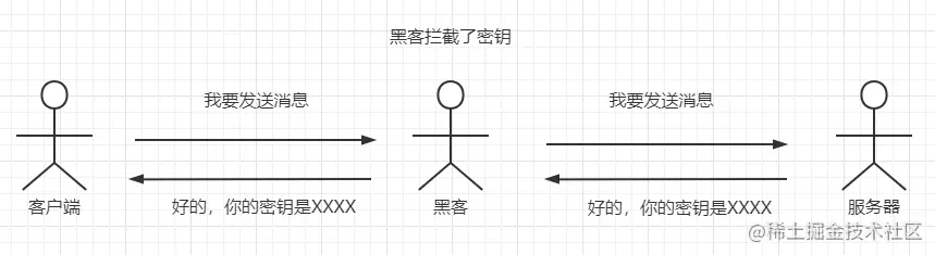 看起来似乎使用对称加密要更安全一点了,但是密钥发送过程中一旦被黑客劫持那么依然是“裸奔”状态: