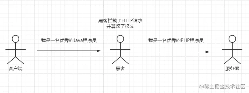 正常情况下,当发送方使用HTTP向接收方发送一个消息时,是能够正确传输的,但是一旦有黑客进行了中间人攻击,事情的发展就可能超出我们的控制了,比如: