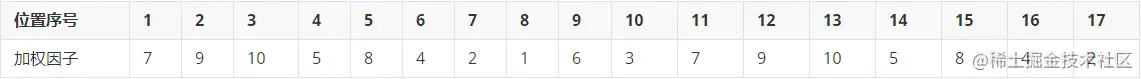 static int[] weights = {7,9,10,5,8,4,2,1,6,3,7,9,10,5,8,4,2}; // 新版身份证号 1-17 位的加权因子. 该数组顺序不能变,和index有对应关系