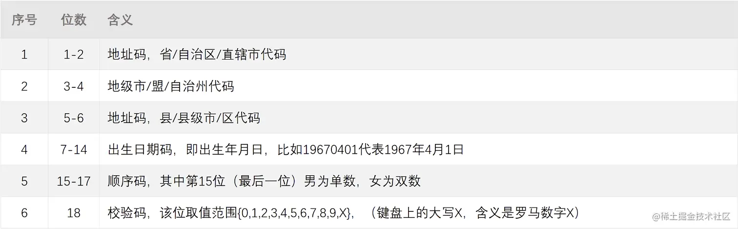 18位组成结构:地址码 + 出生日期码(8位) + 顺序号 + 校验码
