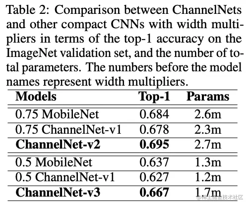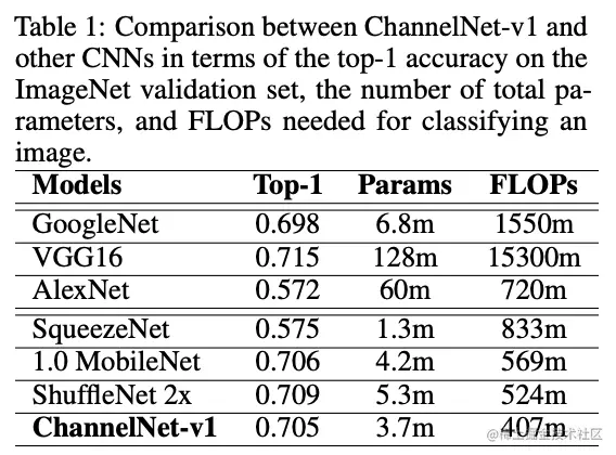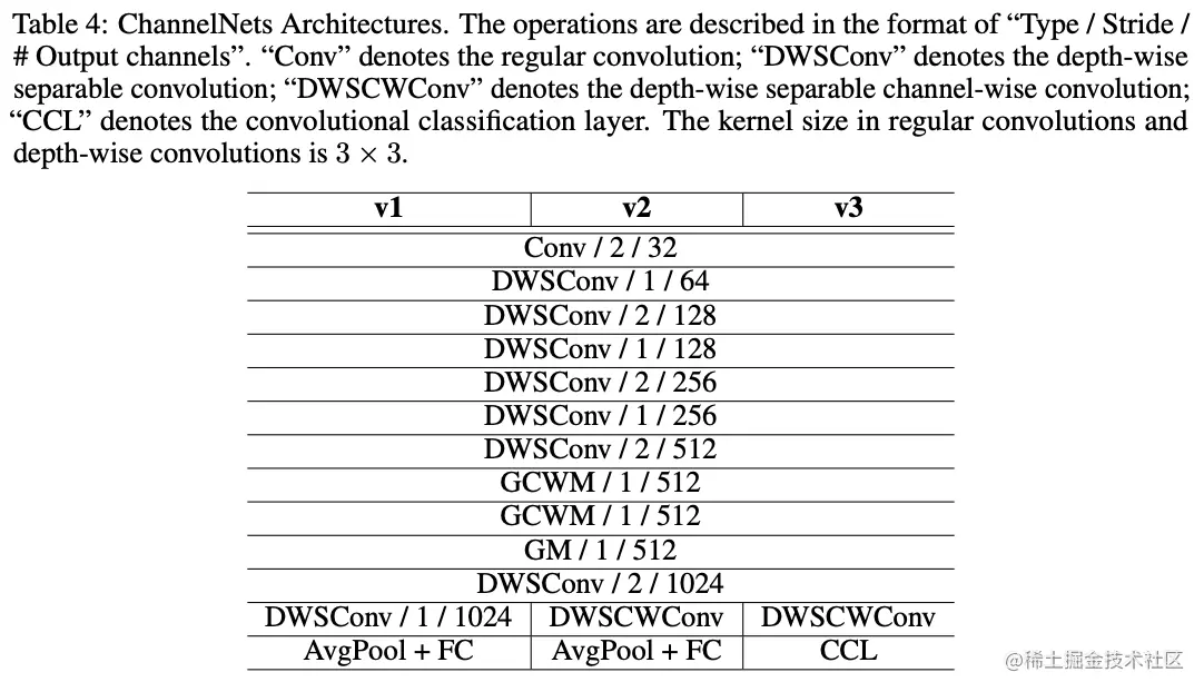 - ChannelNet-v1替换了部分深度可分离卷积为GM和GCWM,分组数为2,共包含约370万参数。