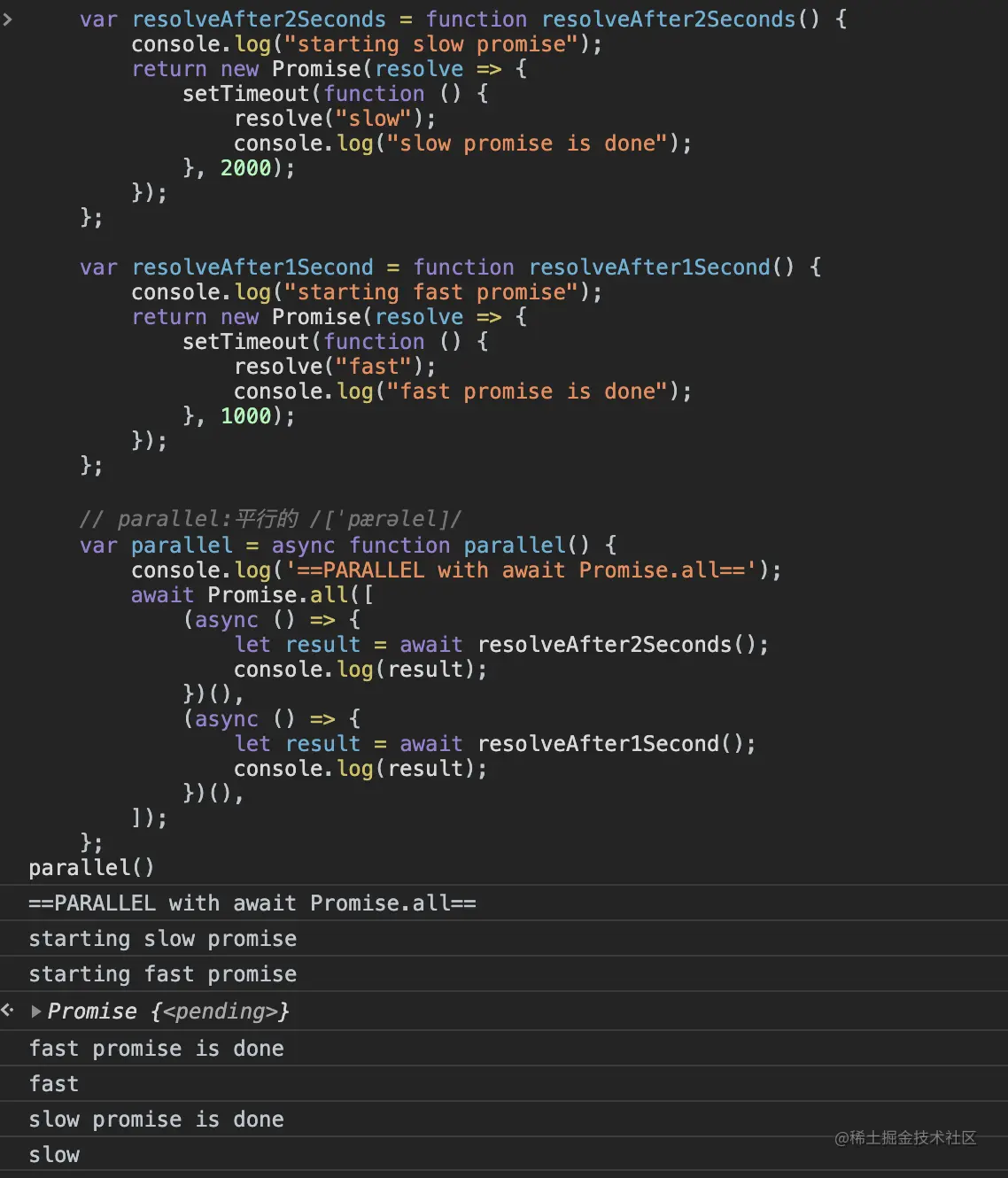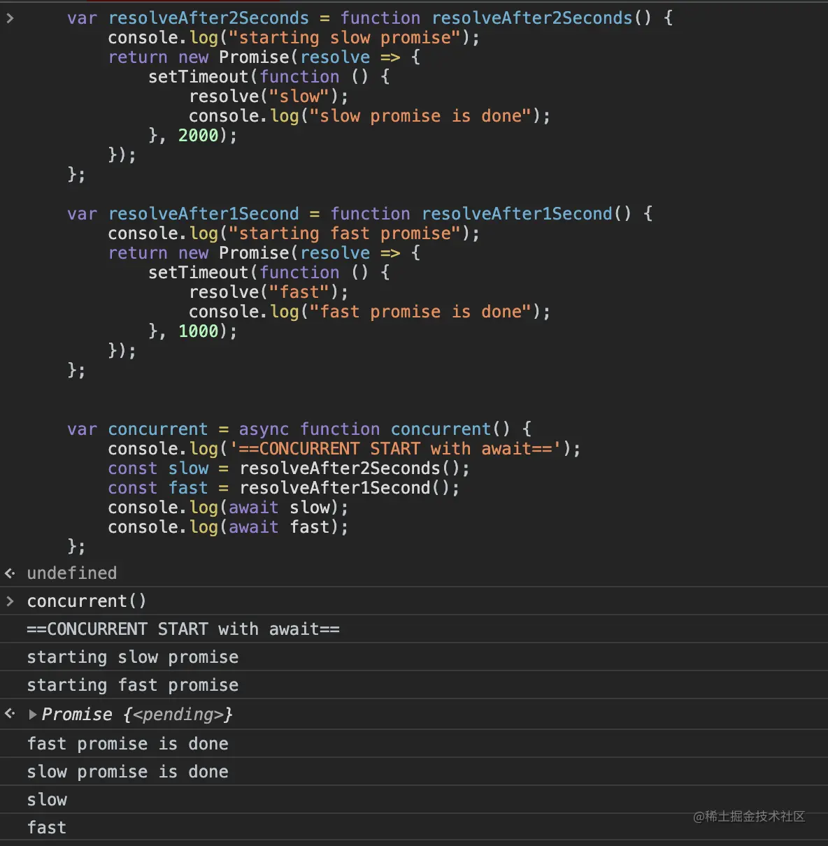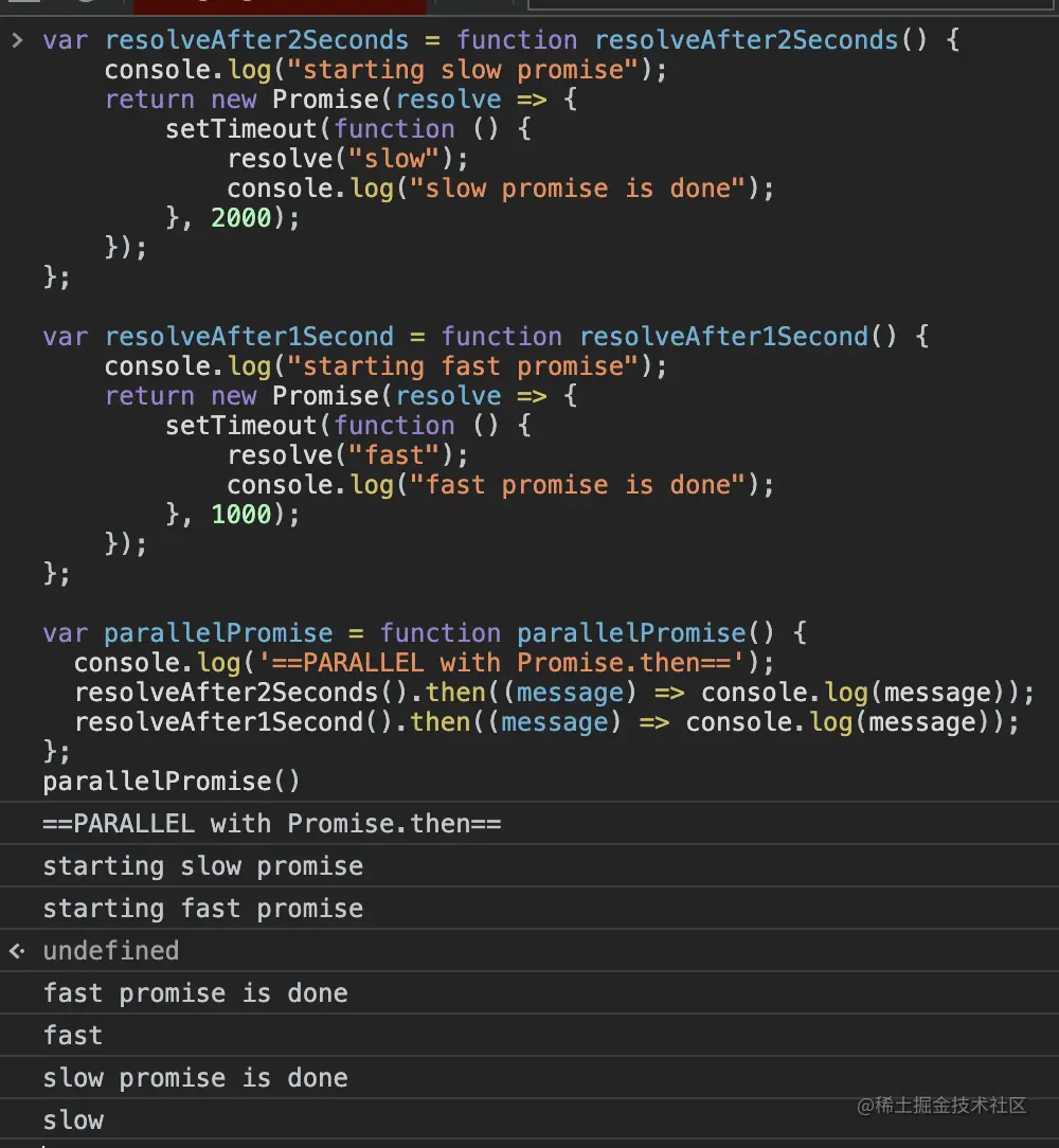 console.log("starting slow promise"); console.log("starting fast promise");