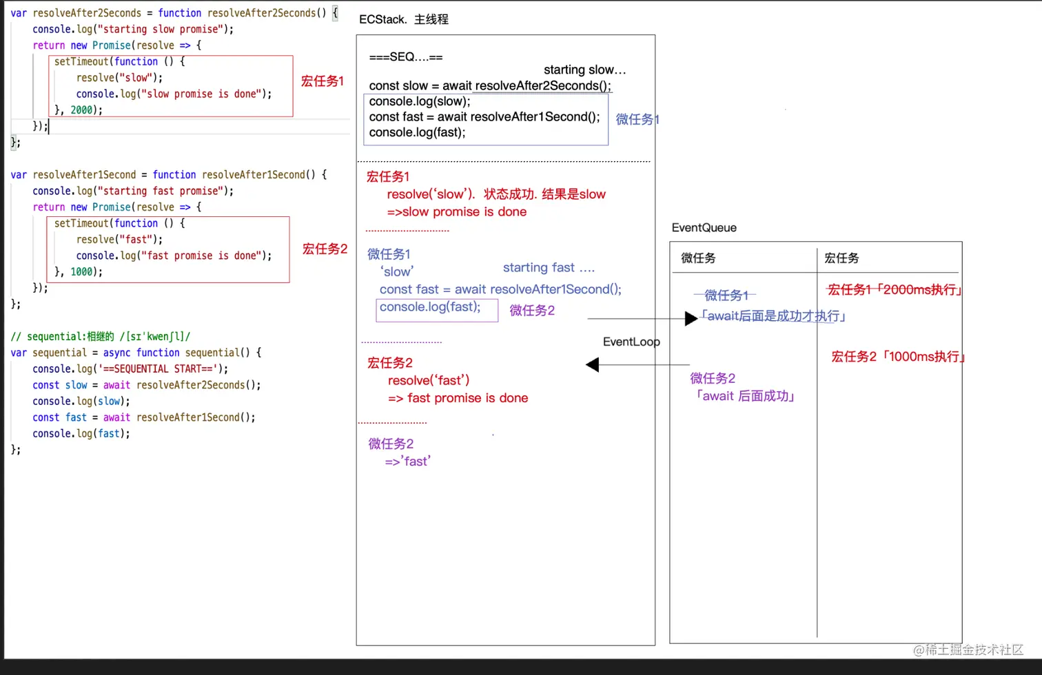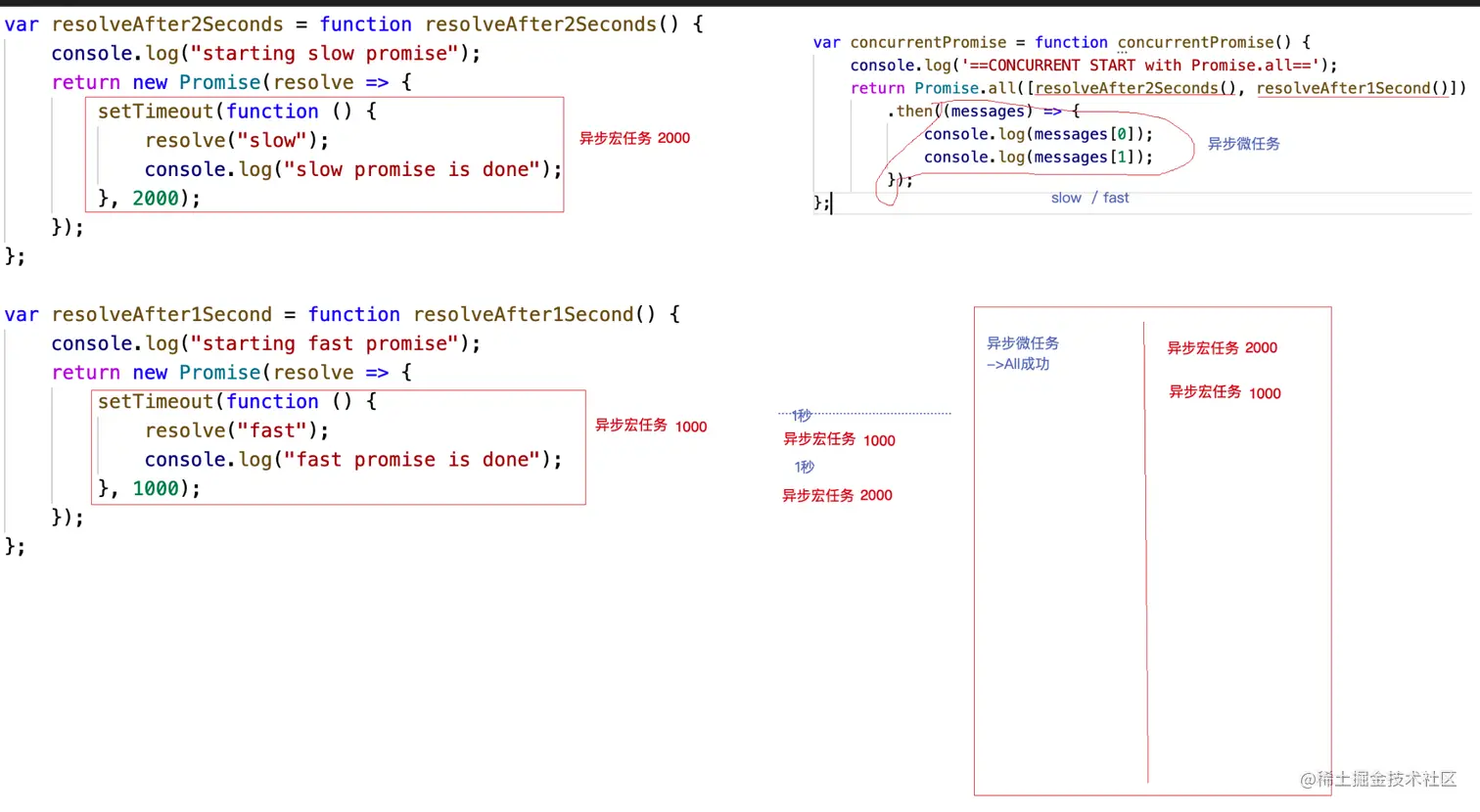 (3)两个异步的宏任务都存储了起来;然后宏任务2先到时间,先输出 console.log("fast promise is done");然后把第二个promise的成功态变成了成功;然后第一个宏任务到时间了 ,输出 console.log("slow promise is done");接着把宏任务一变成了成功;这样输出了slow,然后输出fast