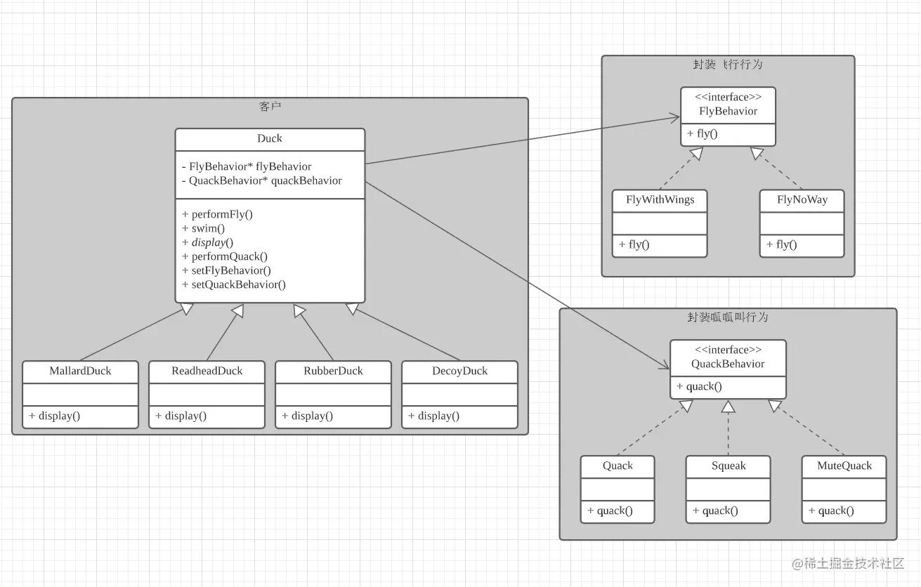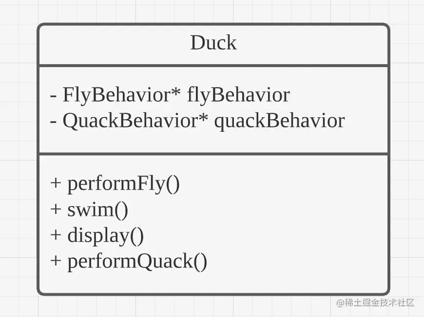 performFly()和performQuack()class Duck { public: void performfly(){ flyBehavior->fly(); } void peformQuack(){ quackBehavior->quack(); } private: FlyBehavior* flyBehavior; QuackBehavior* quackBehavior; } -