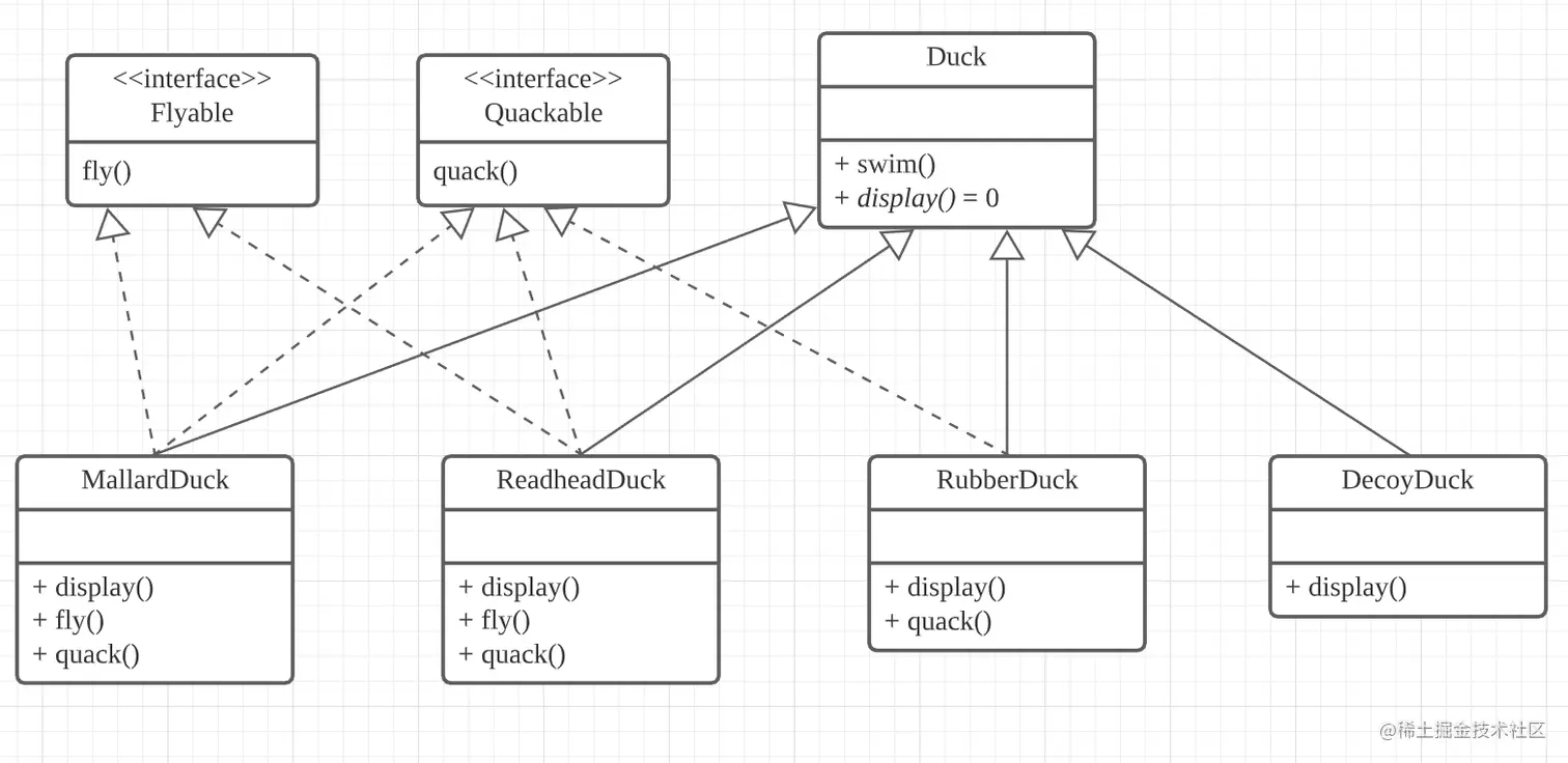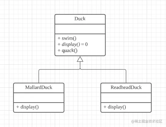 有一款鸭子模拟游戏,叫做SimUDuck。游戏中会出现各种鸭子,一边游泳戏水,一边呱呱叫。当前实现是,系统内部设计了一个鸭子超类Duck,并让各种鸭子继承此超类。同时由于每种鸭子的外形都不一样,因此每个子类都要重写display()方法,故将其设置为纯虚函数。
