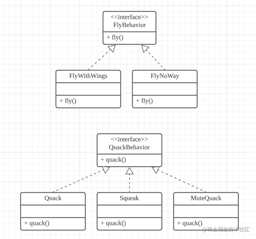 在此,我们有两个接口,FlyBehavior和QuackBehavior,以及它们对应的类,负责实现具体的行为: