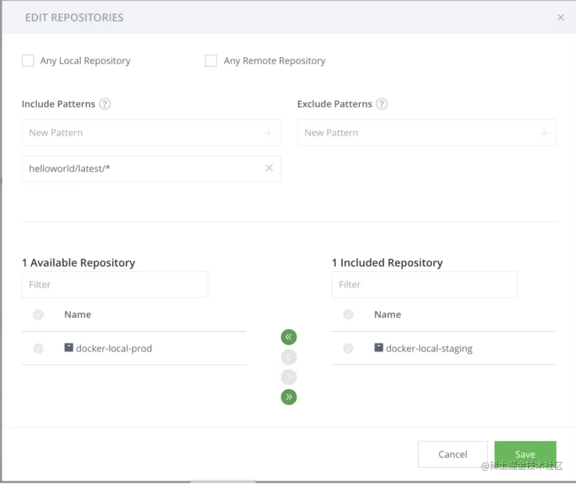 点击“Select Repositories”,然后选择要从中提升镜像的仓库。你也可以在“Include Patterns”部分添加一个过滤器来匹配你的Docker镜像清单。