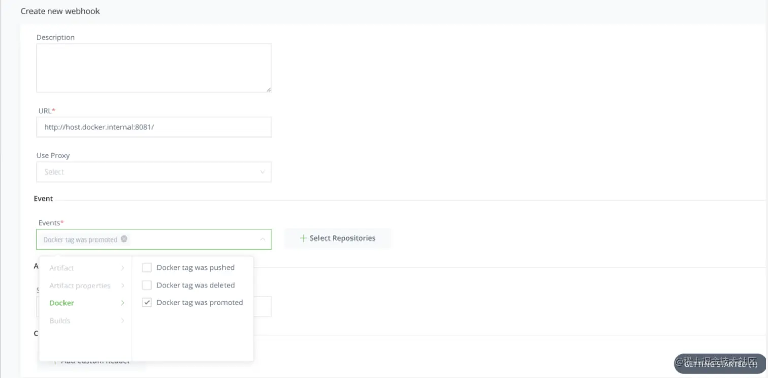 在secret字段中,您可以输入任何您想要的字符串,它将以HTTP header“X-jfrog-event-auth”形式发送到目标服务,这样您就可以验证查询是否来自可信的源。