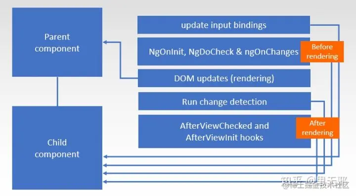 这说明了子组件的变更侦测Run change detection的精确时间点,即在父组件的render渲染结束和父组件的AfterViewXXX钩子之间。所以,这意味着,父组件到了afterViewXXX这一步,子组件就必然已经全部做完侦测了。所以此时再改数据,很危险。而onint时,子组件的变更侦测Run change detection还未开始,所以真的是没关系,改就改,不怕。而为了说明顺序,可以自行尝试在一个child组件和一个parent组件的ngAfterViewChecked生命周期中都console.log('parent / child checked') 可以发现child checked先打印出来。这就好理解了——只有子组件标记完侦测,父组件才会被标记完侦测。