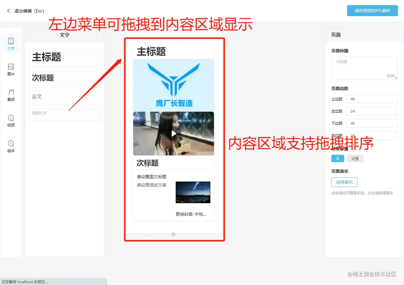在项目中需要实现的效果是,左边的内容组件拖拽到中间显示区域显示,左边内容不支持拖拽排序,中间显示区域支持拖拽排序显示,但不支持拖拽回左边的内容框,如下图所示: