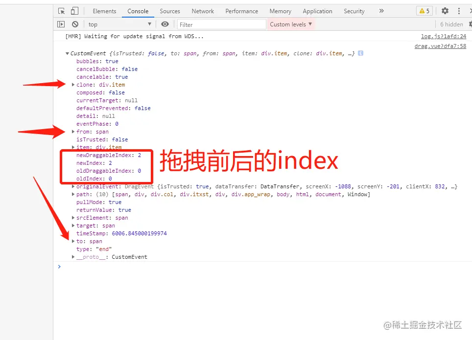 根据打印出来的拖拽结束事件可以得到拖拽之前和拖拽之后的index和内容数组列表,以及拖拽之前DOM节点和拖拽之后的className;