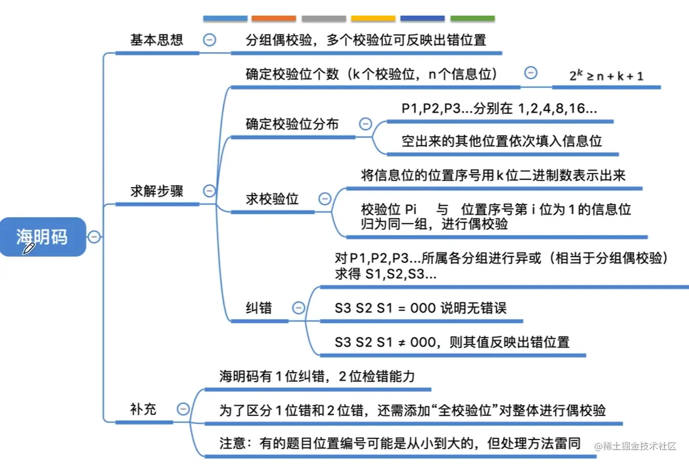 海明码是由贝尔实验室的Richard Hamming 设计的,是一种利用奇偶性来检错和纠错的校验方法。构成方法是在数据位之间的特定未知上插入k个校验位,通过扩大码距来实现检错和纠错。
