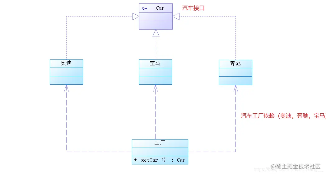 类图清晰简单易懂,就是奥迪,奔驰,宝马,实现了一个名为Car的接口。