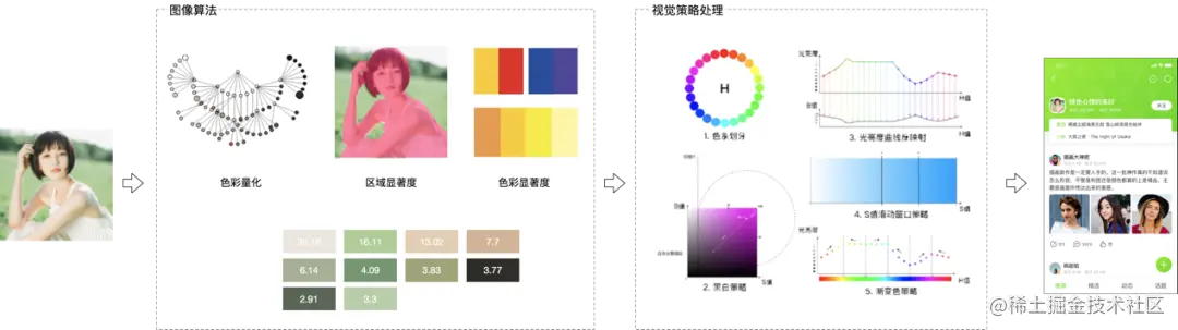 视觉策略的作用是在图像算法产出的候选色集中选择出最能够代表图片的主题颜色,并调整其色相、亮度及饱和度,使这个颜色能够达到产品页面展现的要求(毕竟,最能代表图片主题的颜色不一定符合页面展示的标准)。