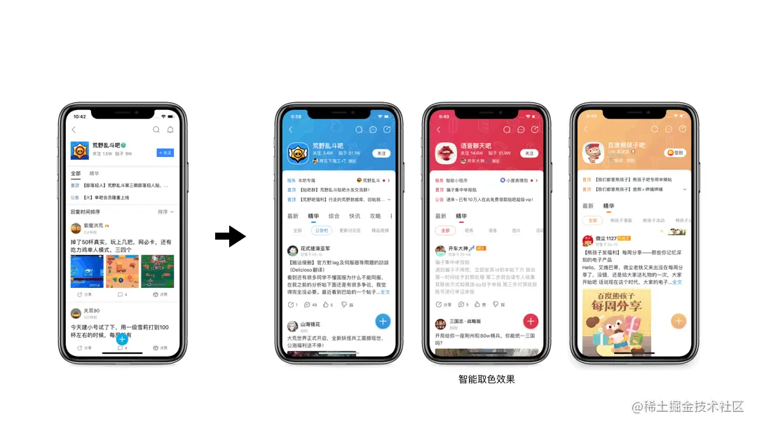 首先是应用在贴吧app的吧首页,随着视觉设计理念的推广和基础服务的升级,智能取色作为中台能力对外提供通用服务,目前已经在多个产品线(手百、品专等)的NA端、H5、PC端、小程序落地应用。
