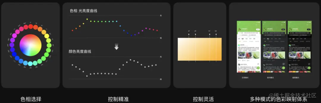 通过根据多模式的色彩映射规则,在产出一套日间模式的主题色字体色等渲染色彩后,都有其相应的夜间模式的映射规则,最终可以产出日/夜/黑一整套的页面渲染色彩。
