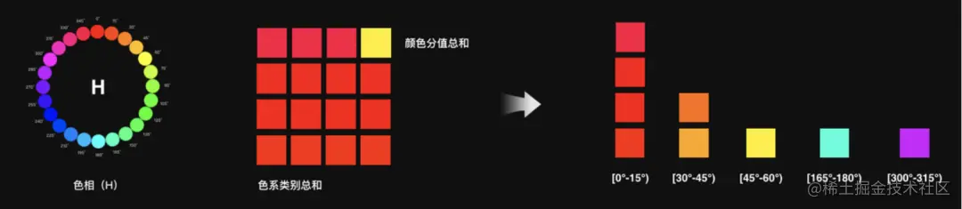 根据场景计算色彩色相,并映射到业务规范色板,定制专属颜色。此方法提取的颜色相对单一,但因为人工定制颜色模版,整体色彩结果与产品调性更加的吻合。