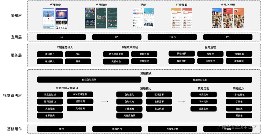 智能取色从用户侧到服务侧主要分为感知层、应用层、服务层、视觉算法层以及依赖的基础组件。