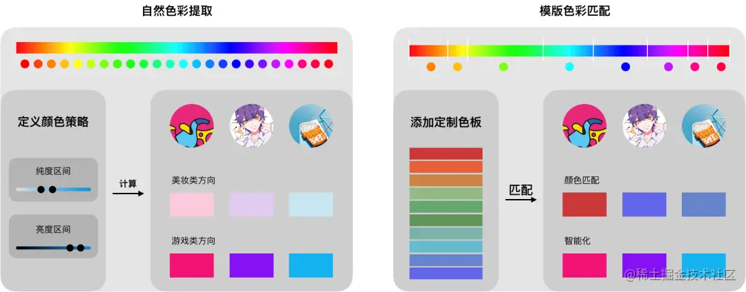 在产品设计层面上,智能取色提供设计规则及解决方案,主要解决如何选色、如何渲染的问题。