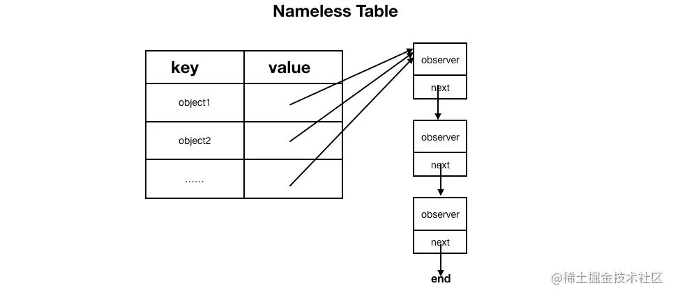 Nameless Table比Named Table要简单很多,因为没有NotificationName作为key,直接用object作为key。相较于Named Table要少一层table嵌套。
