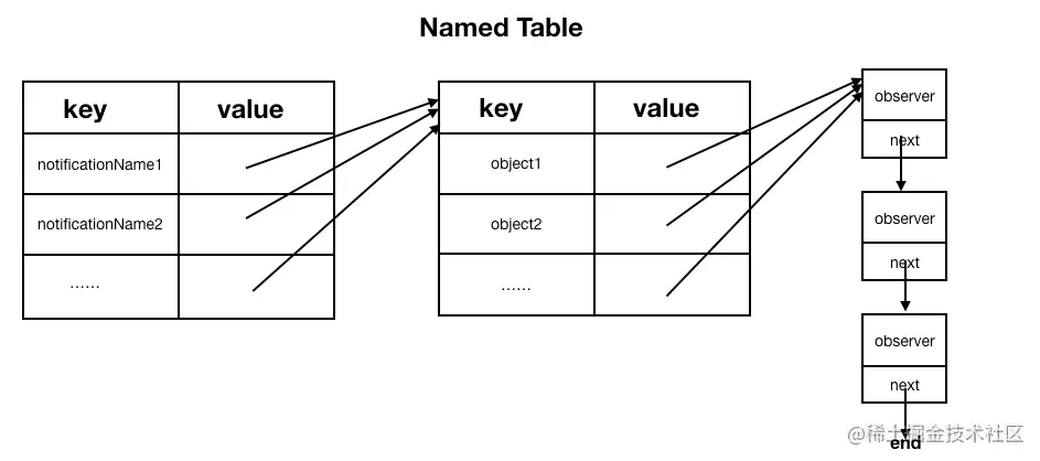 先看用于保存添加观察者的时候传入了NotifcationName的表Named Table。根据表的名字,我们可以猜测出,在Named Table中,NotifcationName作为表的key。但是根据苹果给出的API,我们在注册观察者的时候是可以传入一个参数object用于只监听指定该对象发出的通知,所以还需要一张表来保存object和Observer的对应关系。这张表分别是以object为Key,Observer为value。