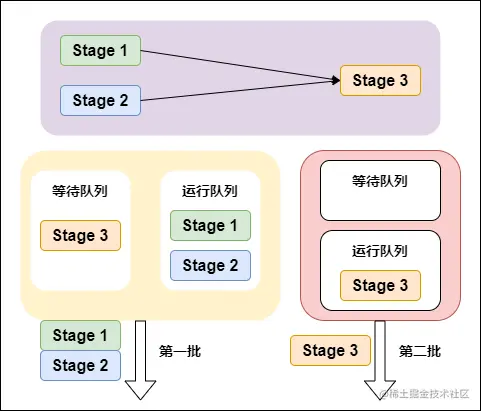同一个Stage可以有多个Task并行执行(task数=分区数,如上图,Stage1 中有三个分区P1、P2、P3,对应的也有三个 Task)。