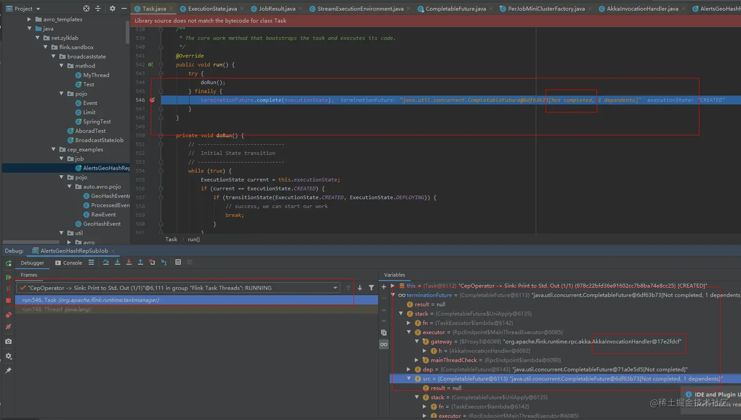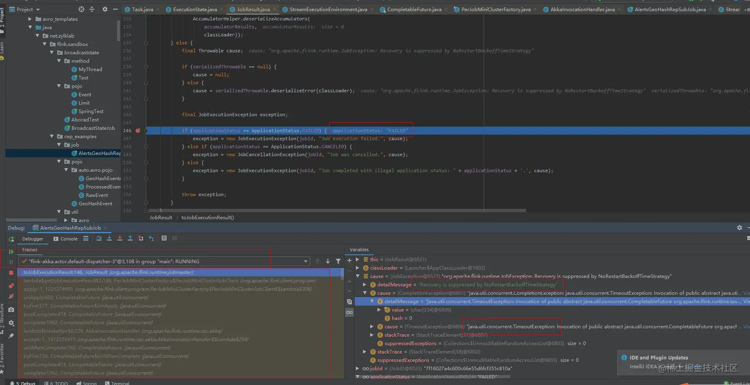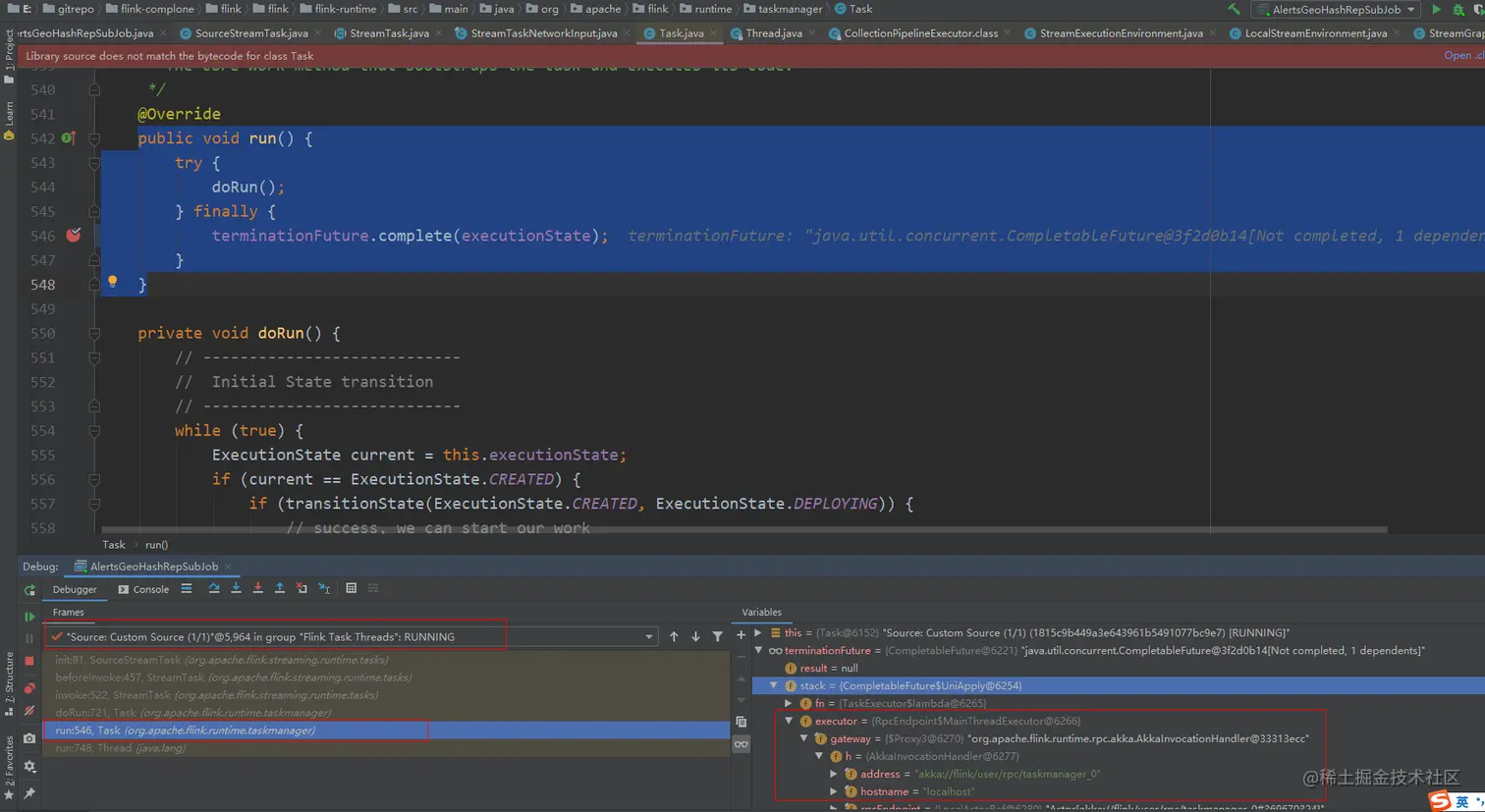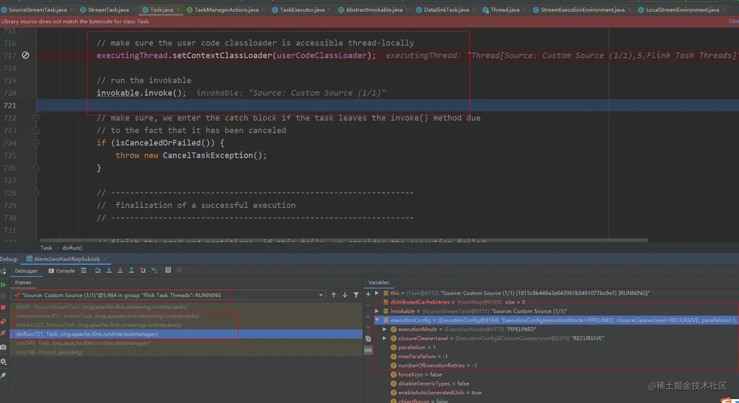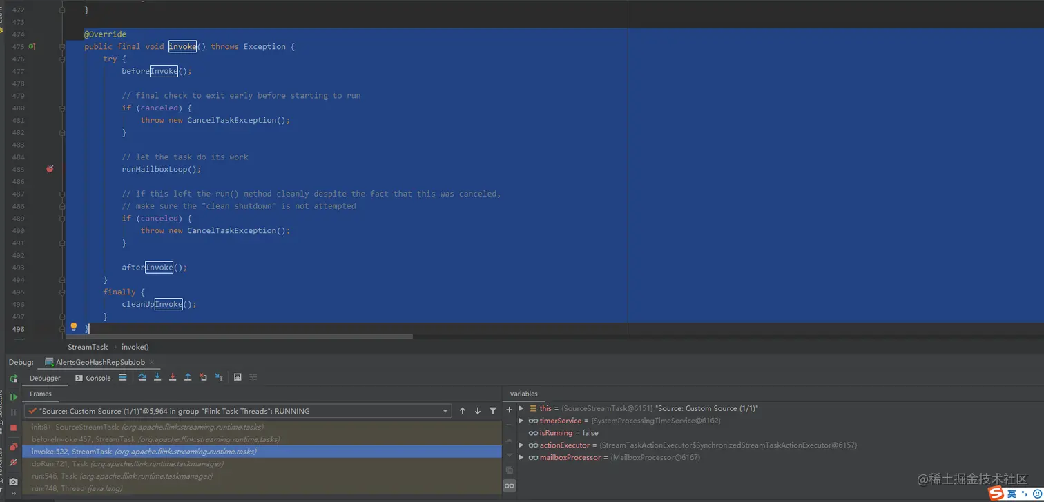 Task#run方法中打了个断点,只要长时间TaskMananger不向JobMananager汇总信息,那么显然这个任务就会失败,触发Task的容错机制