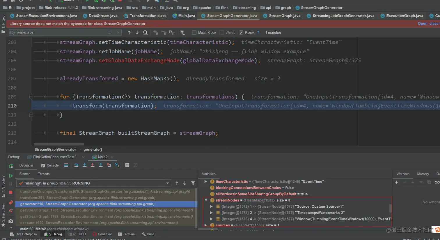 2.将transform函数展开,看到 >> 标注的那一行 由于我们提交的flink job只有一个输入数据源,中间并无进行广播等其他操作,所以进入单数据源的条件分支