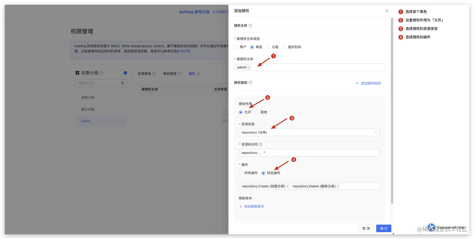 我们授予某个用户「Admin」这个角色,他就具备了「创建代码仓库」和「删除代码仓库」这两个权限。