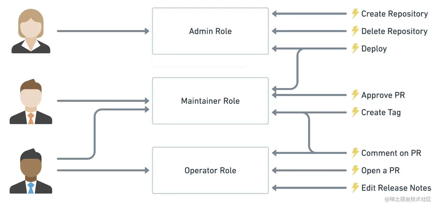 以一个简单的场景为例(Gitlab 的权限系统),用户系统中有 Admin、Maintainer、Operator 三种角色,这三种角色分别具备不同的权限,比如只有 Admin 具备创建代码仓库、删除代码仓库的权限,其他的角色都不具备。