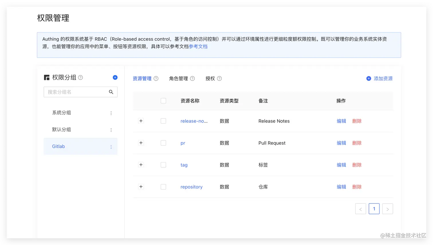 在 Authing 的权限系统中,我们同时支持 RBAC 和 ABAC 的权限模型,即兼顾了管理的效率和授权的粒度。在 Authing 控制台的权限管理模块中可以对资源和角色进行统一管理,并可以采用个性化的授权规则将资源的操作权限授权给角色或者某个用户。