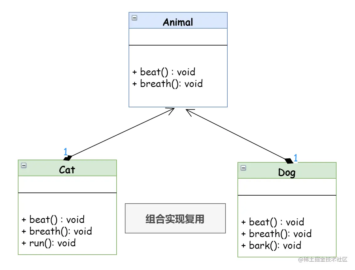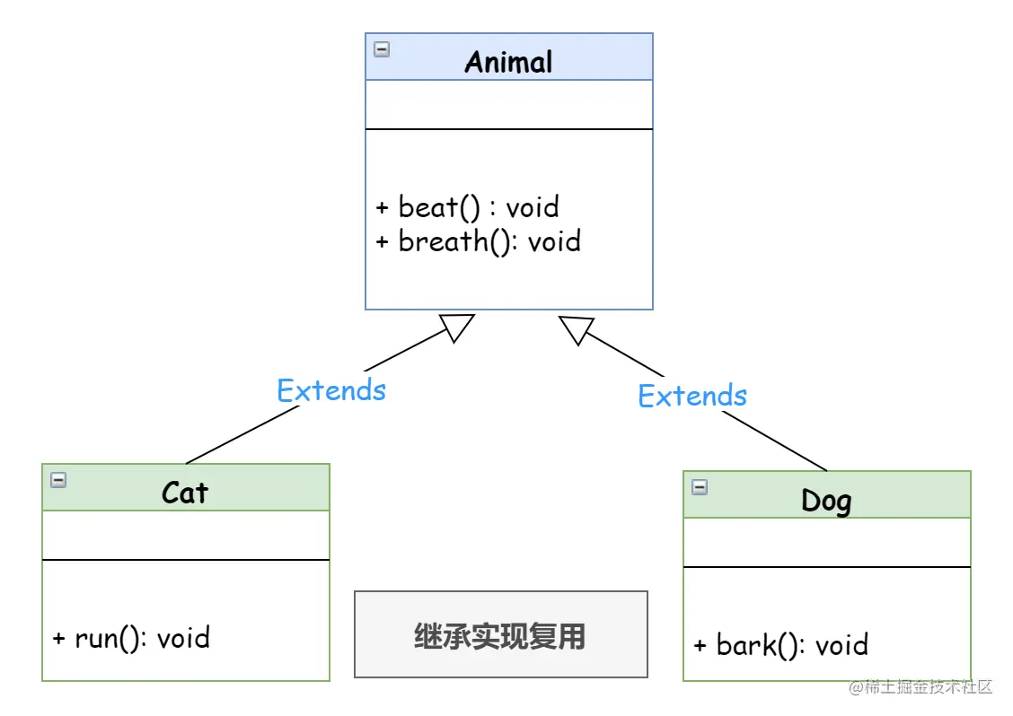 以上便是继承实现复用的方式,Cat 继承自抽象的类 Animal,并将其改造成能够适用于某种特定需求的类。