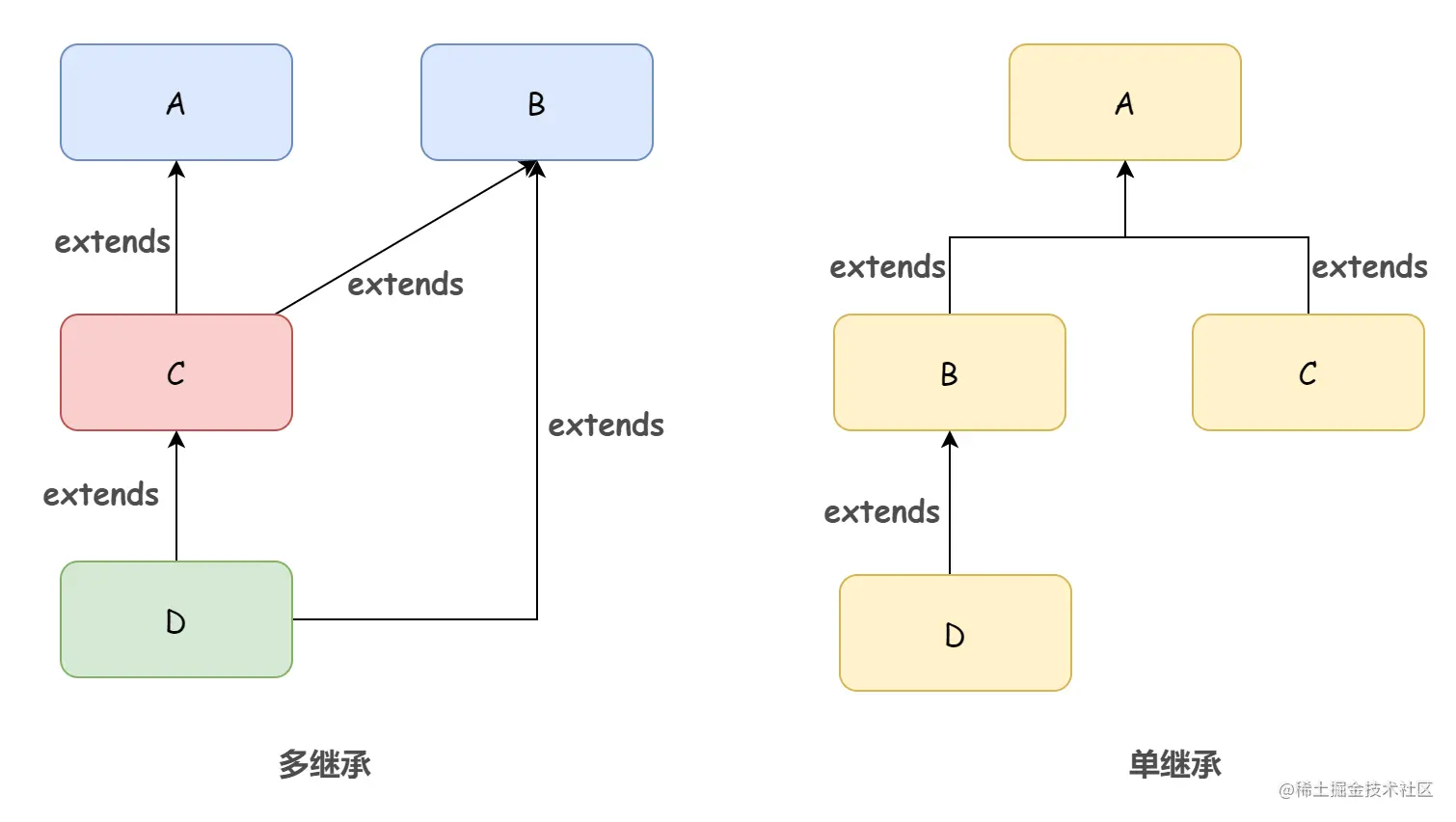 在深入学习 Java 之前,我学的其实是 C++,而 C++ 是支持多继承的,也就是说 A 可以同时继承 B 和 C 甚至更多。然而,在 Java 中,子类只能继承一个父类。也就是单继承。