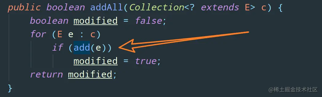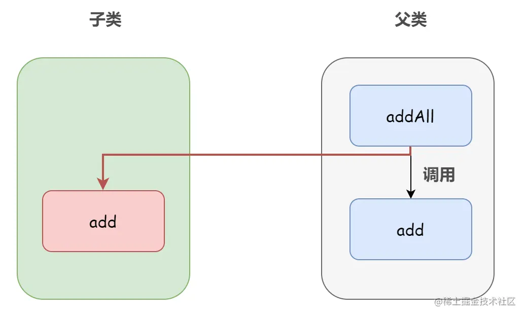 addAll 方法内部调用的是 add() 方法。也就是说,按照上面子类重写的逻辑,子类在调用自己的 addAll() 方法时,首先 addCount 会加 3,然后调用父类的 addAll() 方法,父类的 addAll() 又会调用子类的 add() 方法三次,这样 addCount 又会再加 3。