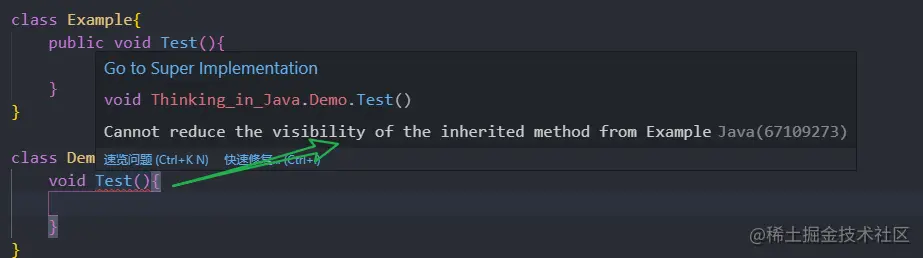 另外,一定要注意的是:在覆盖一个方法的时候,子类方法不能低于父类方法的可见性。特别是, 如果超类方法是 public, 子类方法一定要声明为 public。常会发生这类错误:在声明子类方法的时候, 遗漏了 public 修饰符。此时,编译器将会把它解释为试图提供更严格的访问权限: