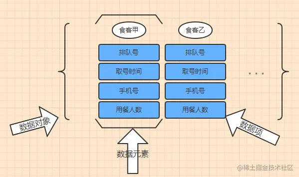 可以说数据结构是数据的表示方式,那么什么是数据呢?数据是对客观事物的符号表示,在计算机科学中是指所有能够输入到计算机中并被计算机程序处理的符号的总称。数据元素作为数据的基本单位,在计算机中程序中可以被单独处理,例如,海底捞的叫号系统,每一个取号信息可以被认为是一个数据元素,一个数据元素中又包含若干个数据项,同样以海底捞叫号系统为例,每个取号信息作为一个数据元素,其中又包括了手机号码,用餐人数等等。这些信息都被认为是一个数据项。而所有的叫号信息我们称之为数据对象(数据对象:数据相同的数据元素的集合,是数据的一个子集),具体如下图所示。