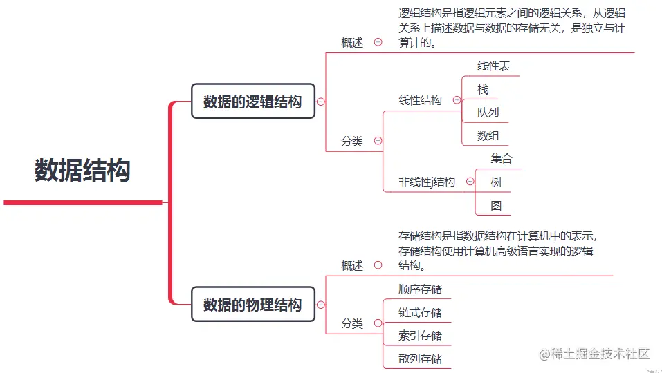 前面提到==数据结构(data structure)是相互之间存在一种或多种特定关系的数据元素的集合==,这里我们又可以将其分为,逻辑结构和物理结构两种类型。逻辑结构描述的是数据元素之间的逻辑关系,与计算机的实现无关,物理结构(存储结构)描述的是数据元素在计算机中的表示,具体分类如下。