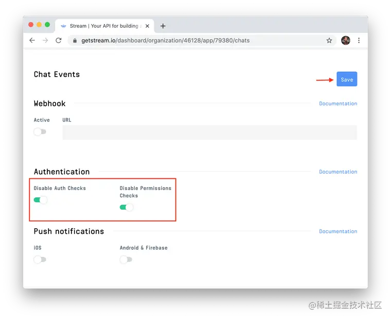 为简化起见,让我们同时禁用身份验证检查和权限检查。确保点击保存。当您的应用程序在生产中,您应该保持这些启用,并有一个后端为用户提供令牌。