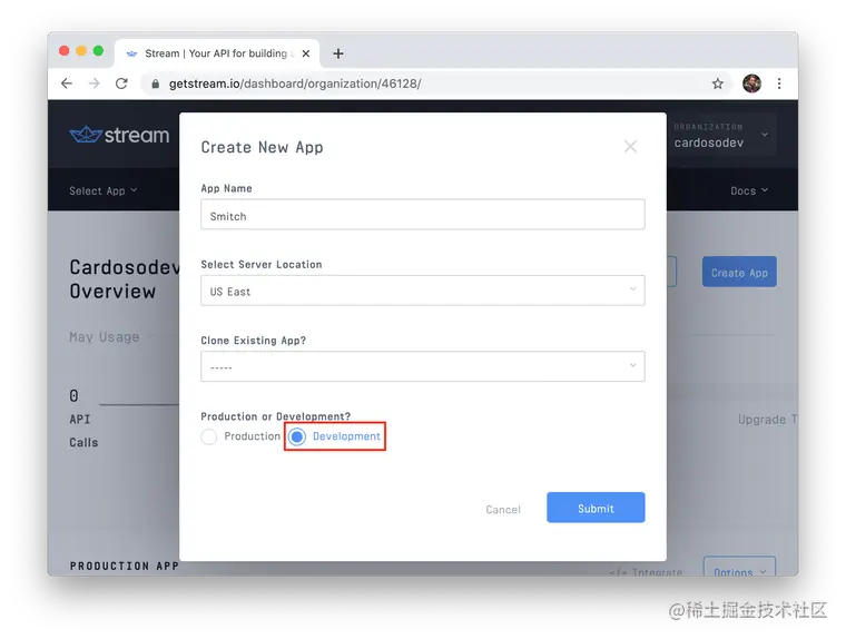 在GetStream.io上创建帐户,创建一个应用程序,然后选择开发而不是生产。