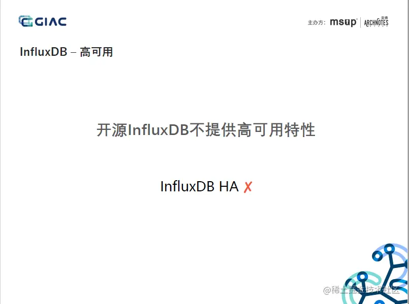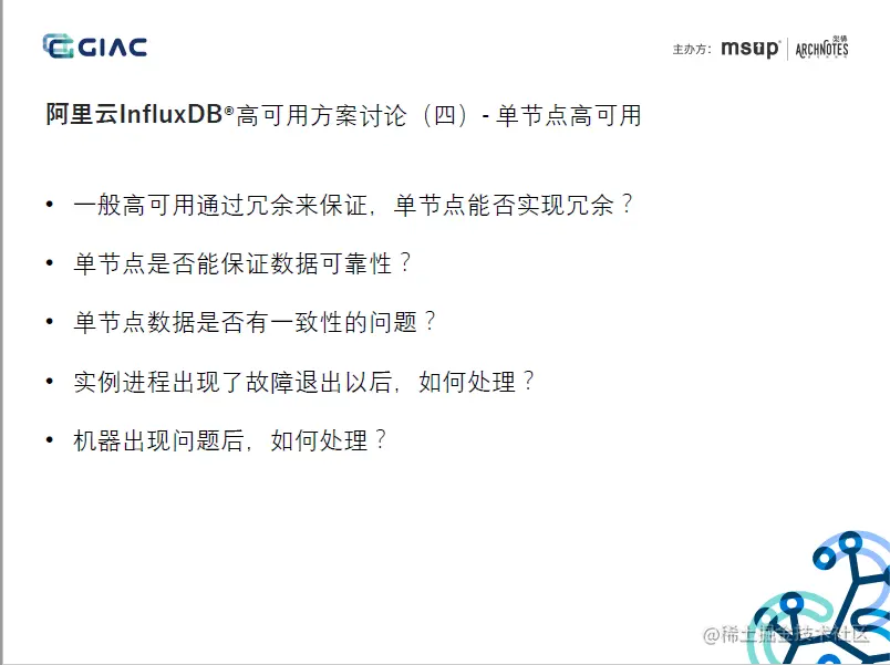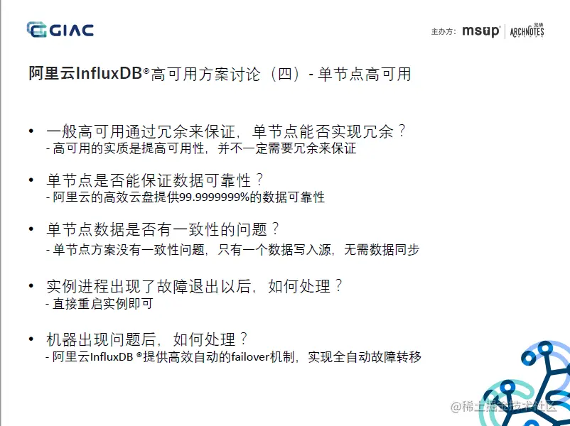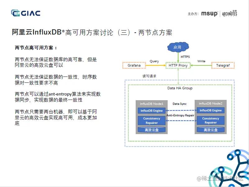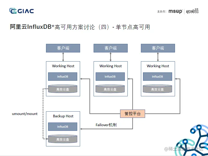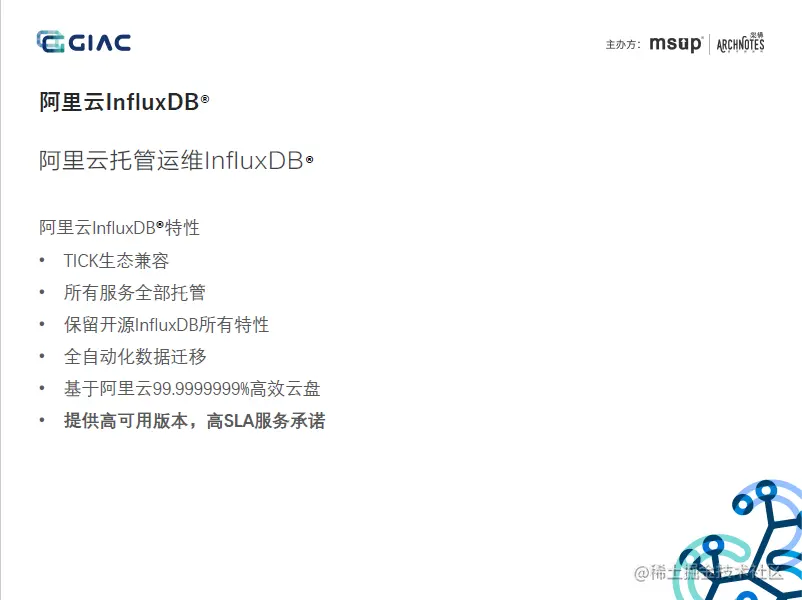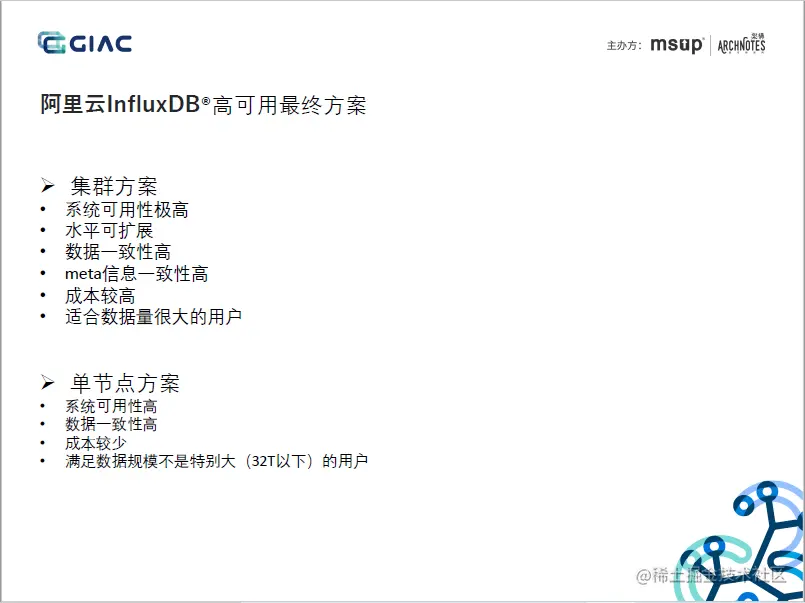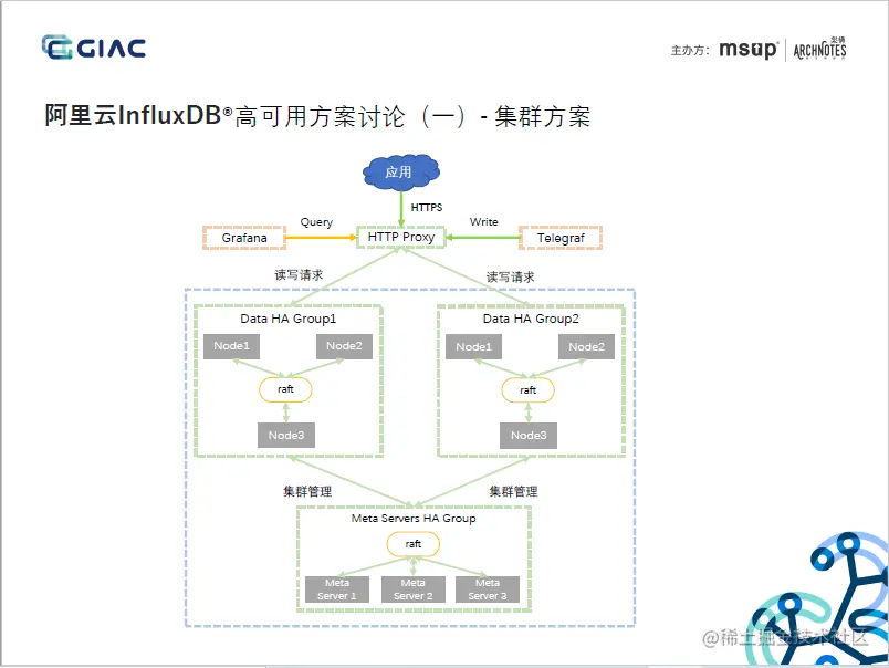 本文将以阿里云在GIAC的分享《云原生InfluxDB高可用架构设计》为例,剖析阿里云的自研InfluxDB集群方案的当前实现,在分析中会尽量聚焦的相对确定的技术、架构等,考虑到非一线信息,在个别细节上难免存在理解偏差,欢迎私聊讨论: