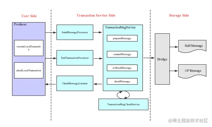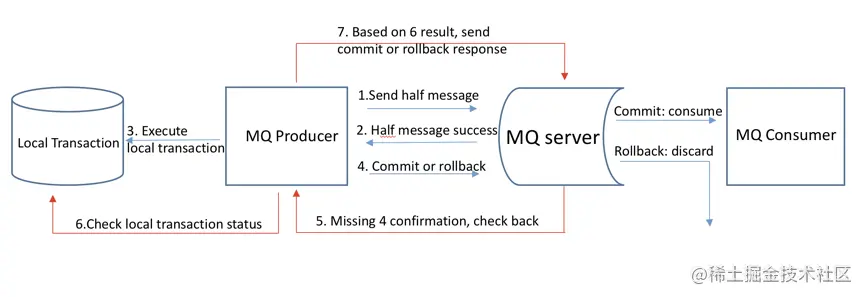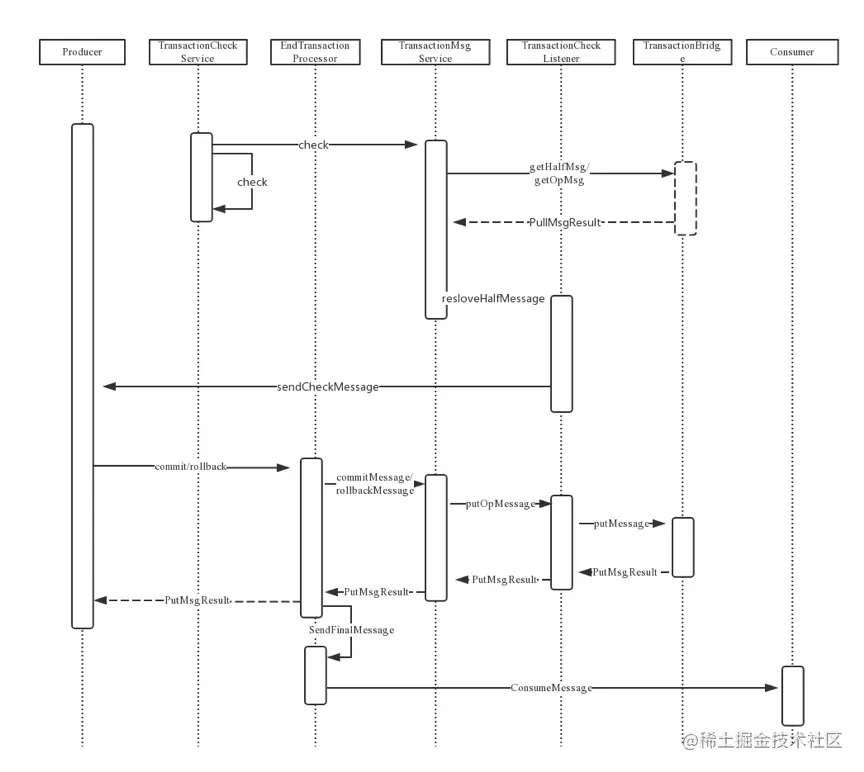 如果缺少第四步,在执行本地事务期间提交/回滚消息丢失或生产者挂起,MQ server将向同一组中的每个生产者发送检查消息以获取事务状态。