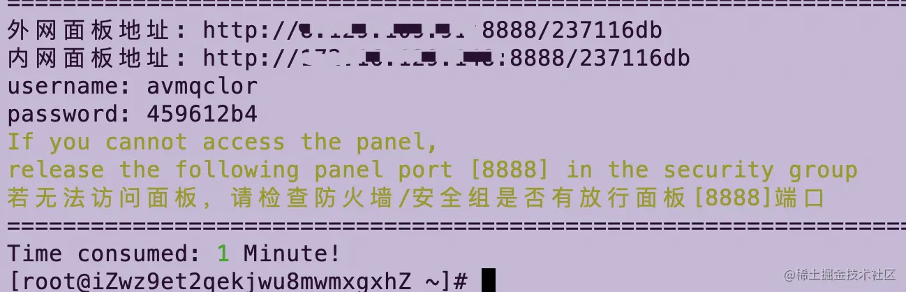 3、等待几分钟,安装完成后,页面上会出现登录账户和密码(先复制出来,登录进去后可以修改)